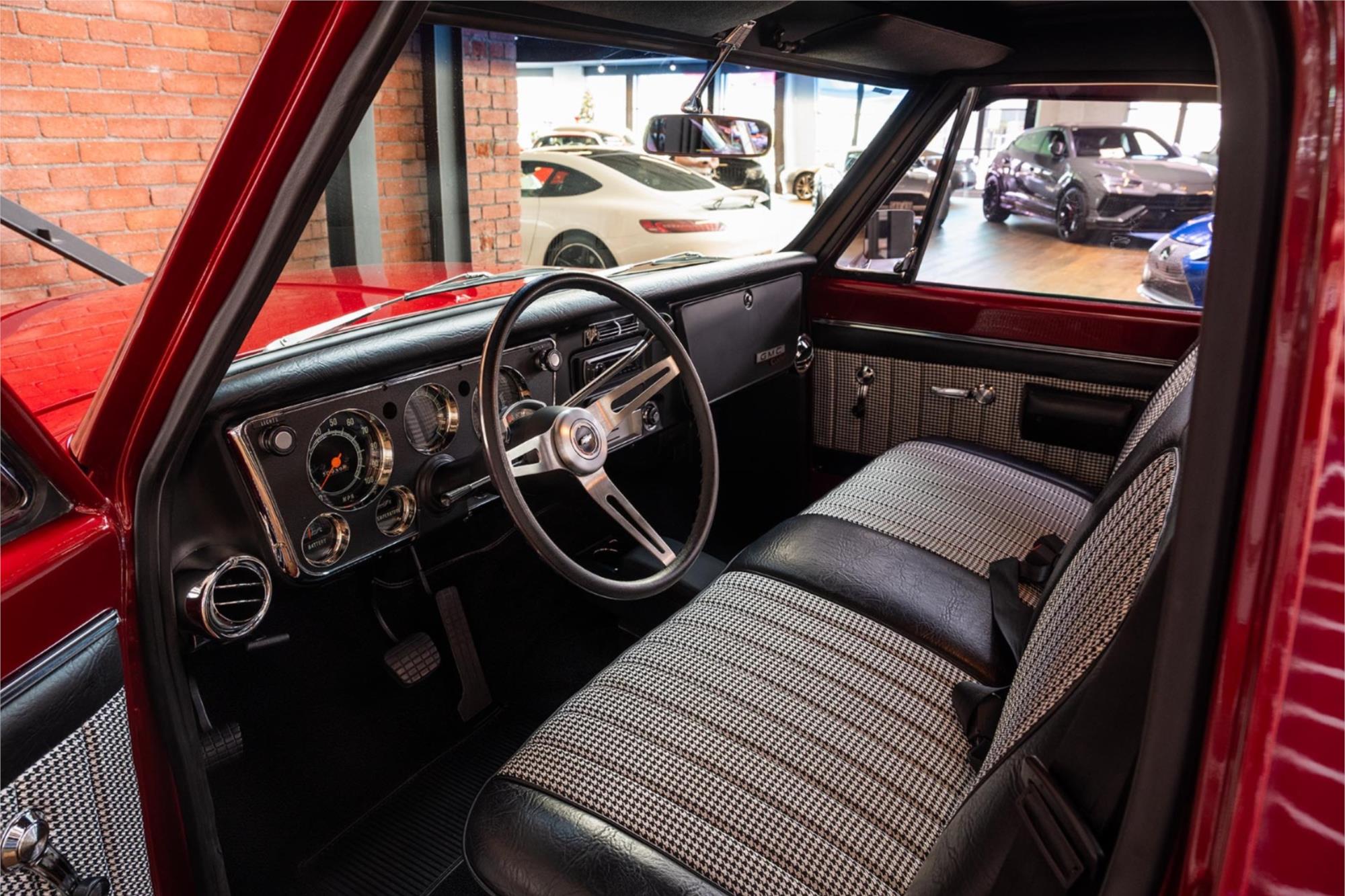 Presenting in Maroon with Black & White Houndstooth designed interior trim.