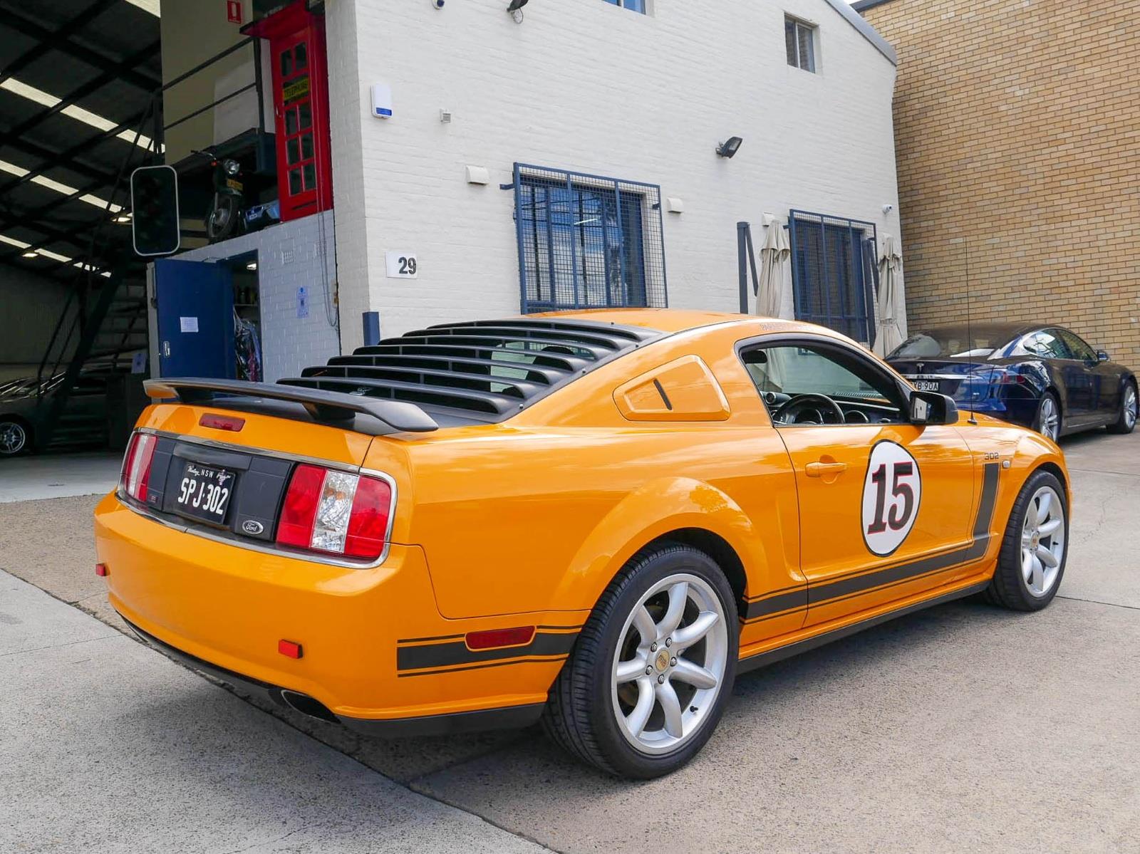 - The nostalgic touches, applied in Irvine, consist of black side and hood stripes, the latter framing a functional "shaker" hood; a black decklid, rear spoiler, and louvered rear window cover; and 19-inch Minilite-inspired alloy wheels. Of course, all the powertrain and chassis goodies are there, too, including a 3.73:1 rearend, a Tremec five-speed manual, specially calibrated Saleen N2 dampers and linear-rate coil springs, a Watts Linkage on the live rear axle, 14-inch slotted front brake discs with four-piston calipers, and the requisite 302-cubic-inch, 24-valve Ford modular V-8 replete with forged-aluminum pistons and forged-steel connecting rods and crankshaft.