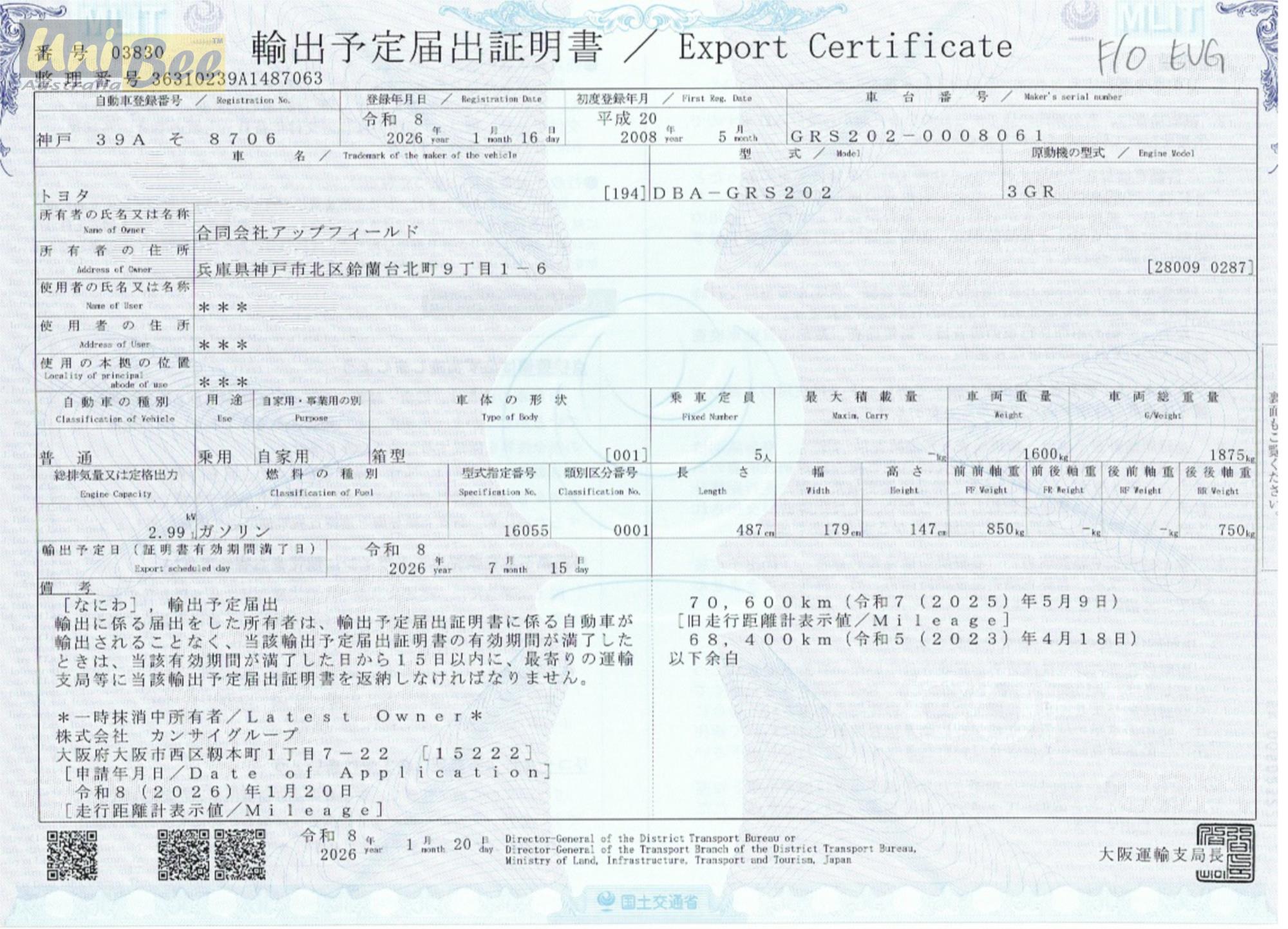 Title 2008 Toyota Crown Royal Saloon Sedan GRS202
