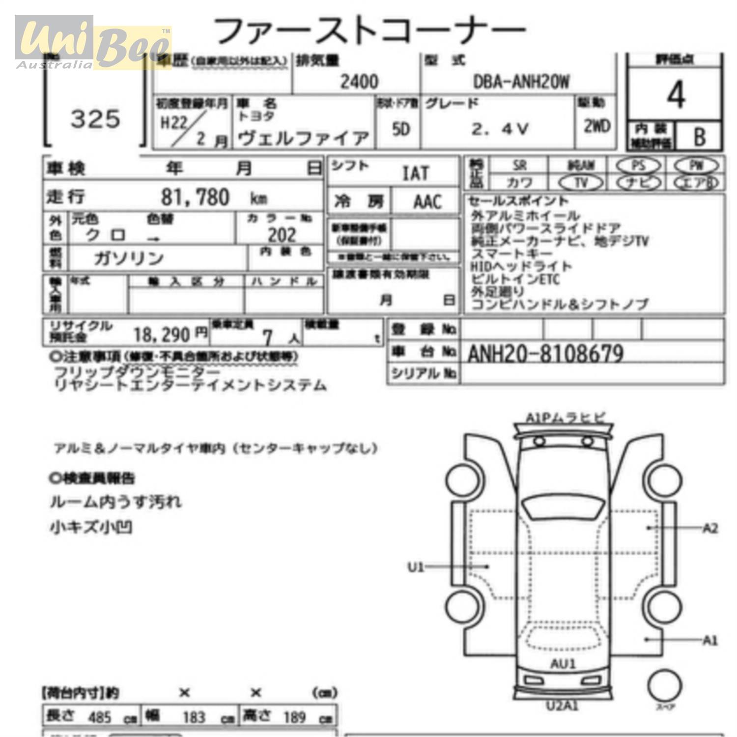 Title 2010 Toyota Vellfire Z Wagon ANH20W