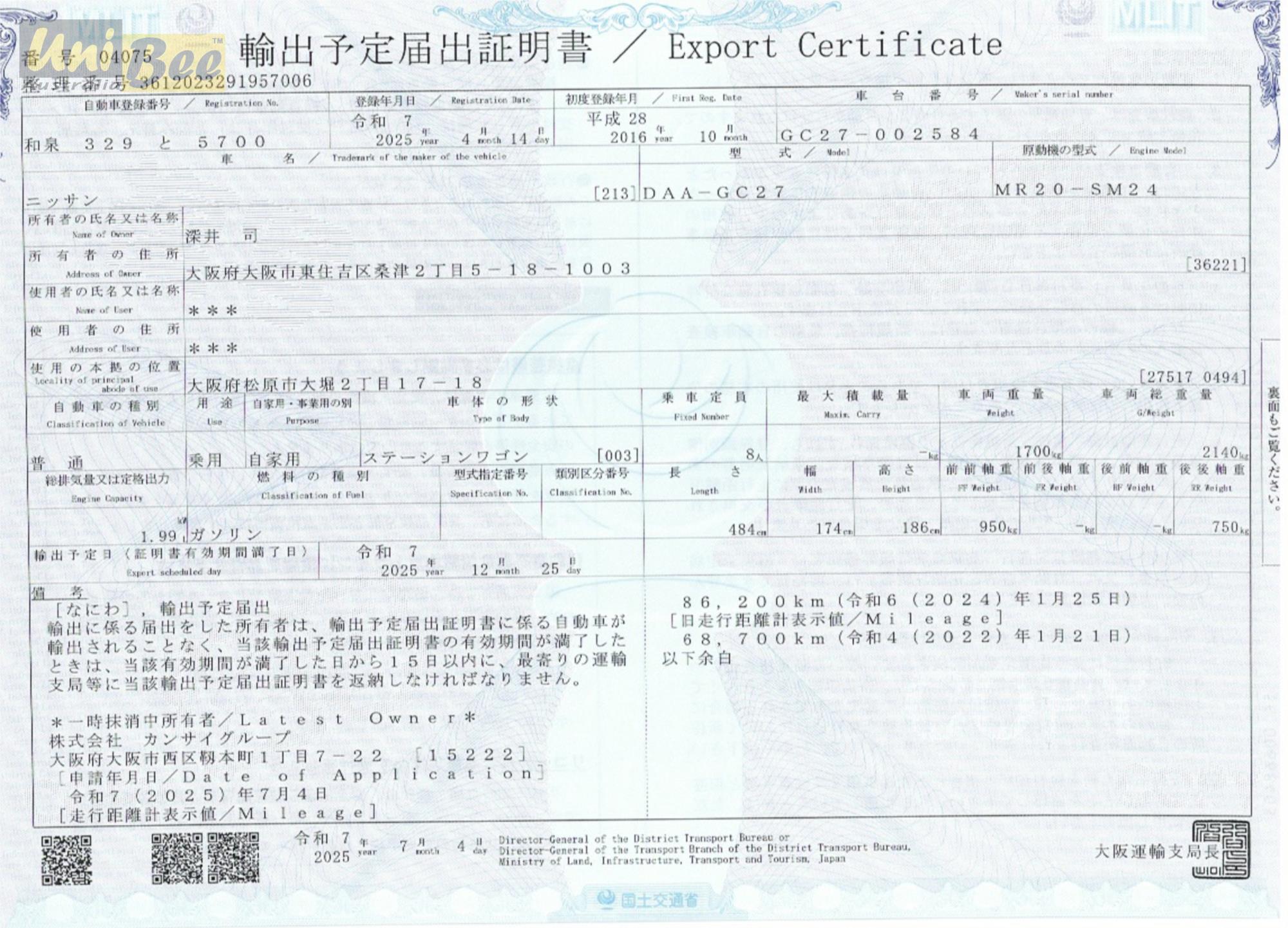 Original export certificate and auction report with every car
