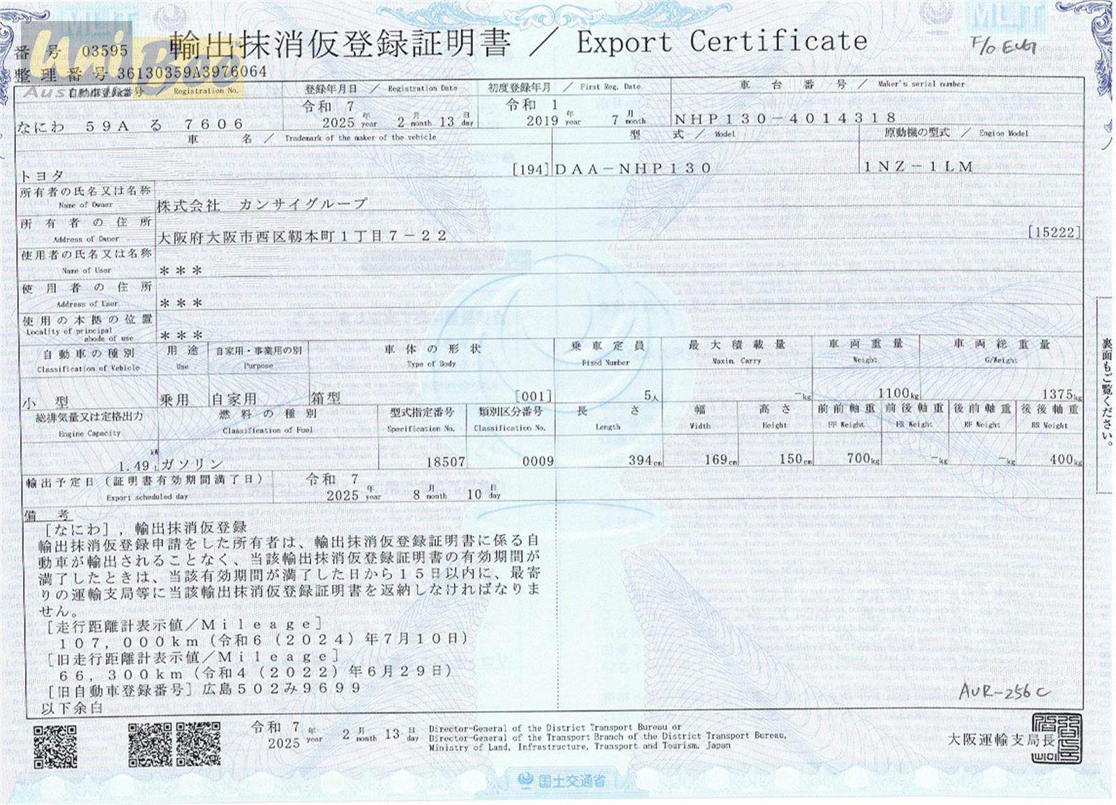 Original export certificate and auction report with every car